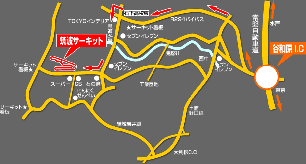 谷和原ICより 国道294号線を常総(旧水海道)方面へ 圏央道の常総ICを過ぎて『石下紫峰高東』交差点を左折 左前方に『日本一ながいチョコ』のポールのある交差点を右折 直進すると右手に筑波サーキット到着 ※一般観戦の入場はAゲートです